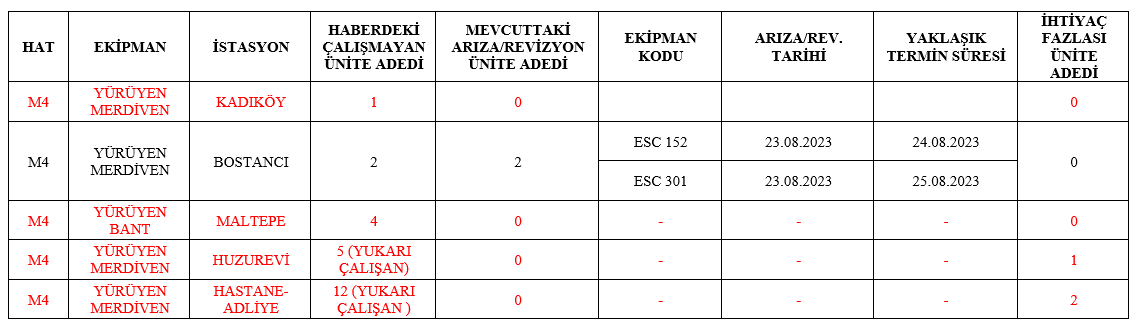 Gerçek: M7 Yıldız-Mahmutbey Metro Hattında toplam 260 adet yürüyen merdiven ve 121 adet asansör bulunmaktadır. Bu ekipmanlardan 22 adet yürüyen merdiven ilgili bölümlerden yolcu alınmaması nedeniyle çalıştırılmamaktadır. An itibarıyla arızalı ekipman bulunmamaktadır. Güncel bilgiler aşağıdaki gibidir.