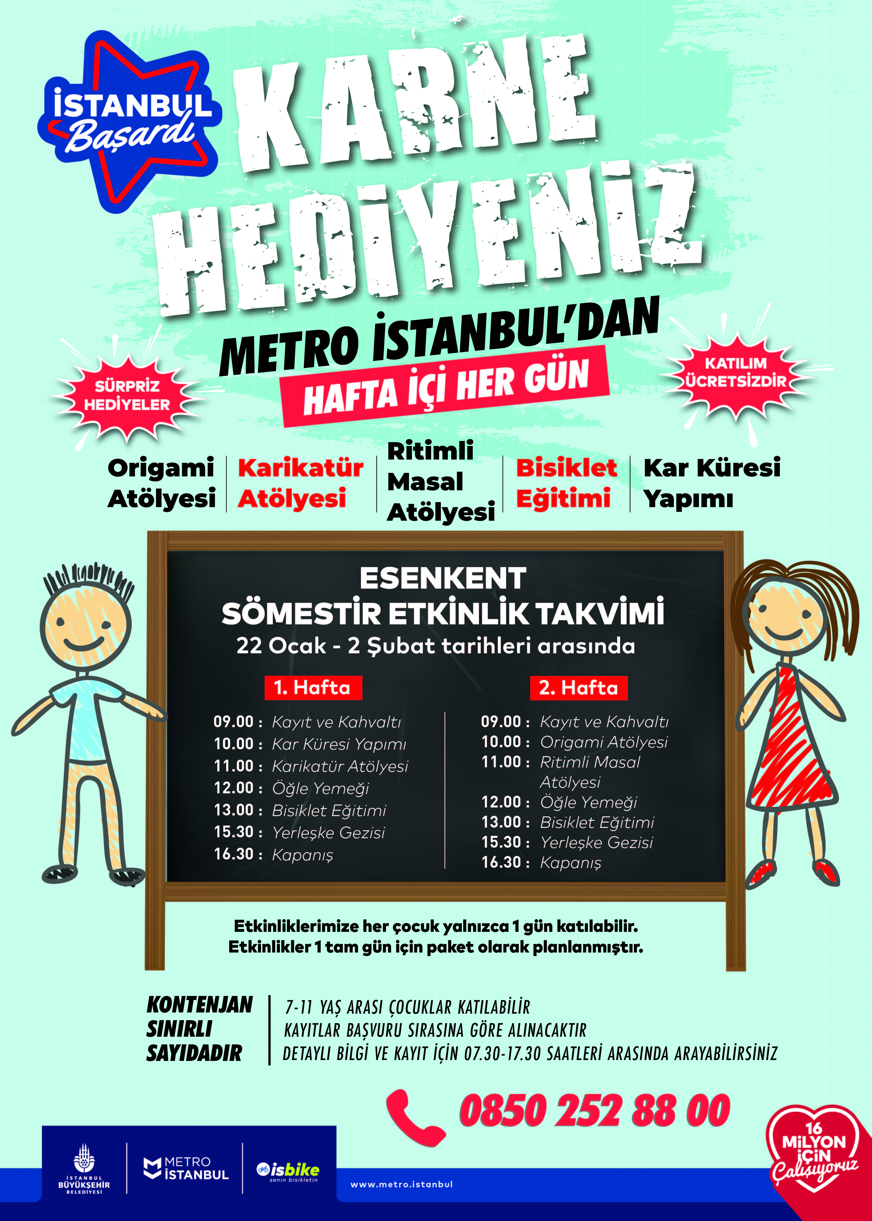 22 Ocak-2 Şubat tarihleri arasında Metro İstanbul’un Esenler ve Esenkent yerleşkelerinde hafta içi her gün gerçekleştirilecek etkinlikler kapsamında 7-11 yaş arasındaki çocuklar; bisiklet eğitimi, origami atölyesi, karikatür atölyesi, ritimli masal atölyesi, kar küresi yapımı, film gösterimi ve yerleşke turlarından ücretsiz olarak yararlanabilecek. Her çocuğun yalnızca 1 gün katılabileceği etkinliklere 0850 252 88 00 numaralı telefondan kayıt yaptırılabilecek. Kontenjanın sınırlı olduğu etkinliklere kayıtlar başvuru sırasına göre alınacak.