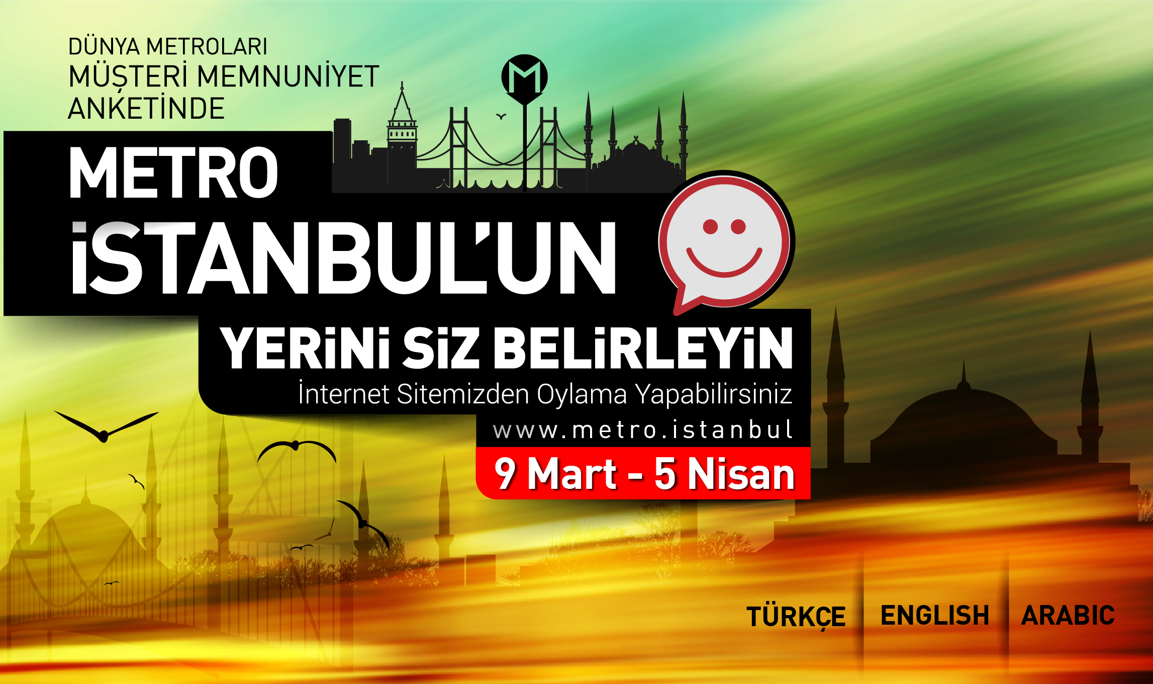Dünya çapında 38 metro işletmecisinin katılımıyla uluslararası düzeyde ve eşzamanlı yapılan Müşteri Memnuniyet Anketi başlıyor. Nova&Comet organizasyonu öncülüğünde gerçekleştirilen anketler ile dünyanın çeşitli ülkelerinden metro şirketlerinin müşteri memnuniyet oranları karşılaştırılıyor. 9 Mart-5 Nisan 2020 tarihleri arasında katılabileceğiniz ankete vereceğiniz cevaplar ile hizmet kalitemizde yapacağımız iyileştirmelerinde şekillenmesine yardımcı olacaksınız.